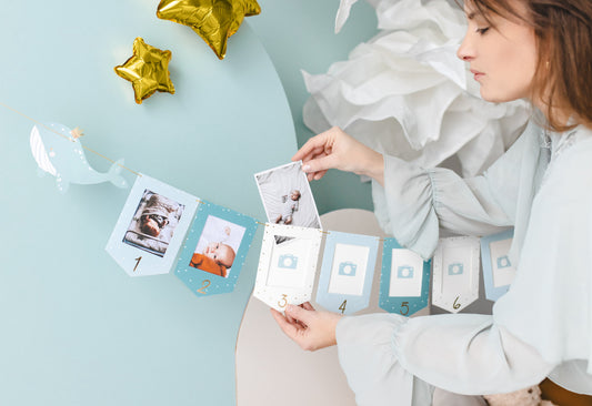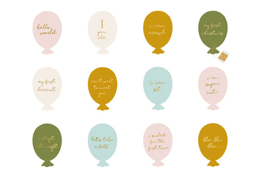 Mēnešu kartītes ar mēneša cipariņu un tekstu “Baloni”, krāsu mikss, 11,5 × 17 cm