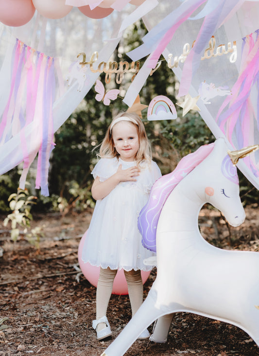 Stāvošs folija balons “Vienradzis”, 95 x 86 cm, bēšā krāsā ar zelta un varavīksnes elementiem